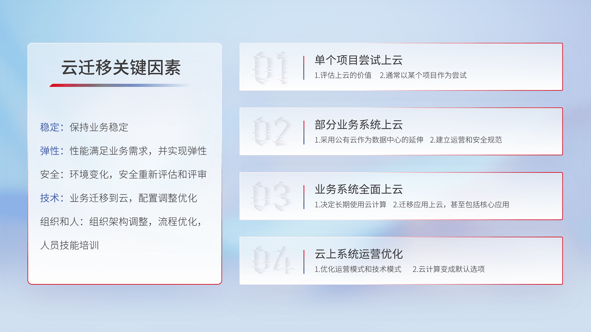 结合实际业务,,从规划设计、、、、云平台选型、、、、云原生改造、、数据迁移、、、、集成交付,,,迁移全过程为客户识别最佳上云路径,,做好风险识别管理,,设计网络架构、、身份权限、、安全审计合规、、、、操作审计、、、日志审计、、、、监控告警策略、、多站点容灾设计等,,,对云上基础设施进行整体规划,,,,提升IT治理水平,,,,以满足弹性、、、、高可用、、、高性能的需求。。。
