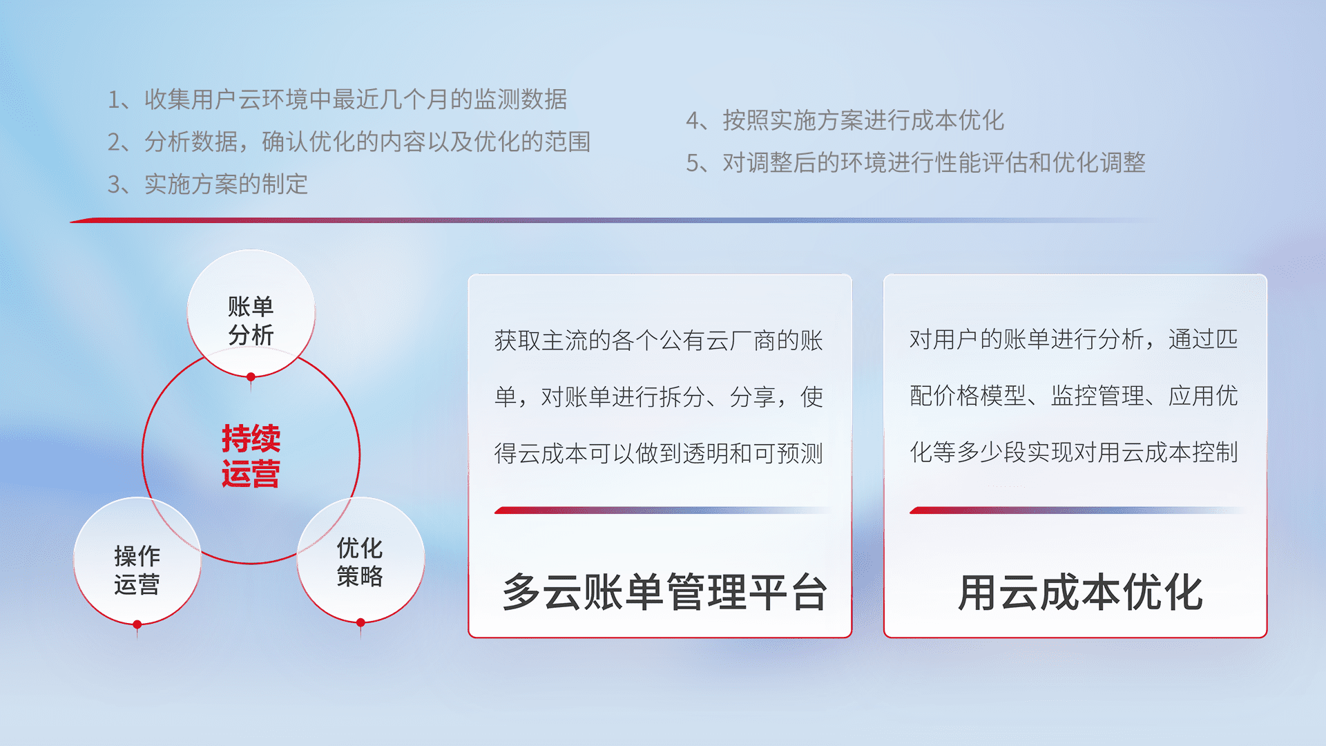 通过多云纳管,,,,以统一的资源数据模型把客户的云资源进行抽象和封装,,,,进而实现对多云资源的统一操作,,保障云资源管理的可靠性、、、稳定性与可用性。。。。量身定制化运维内容,,,,配置、、、、开发运维、、、补丁管理、、、、备份、、、监控、、、认证和访问管理、、审计和日常巡检等,,,保障在用云过程中的可靠度,,,,稳定度以及高可用率。。。。